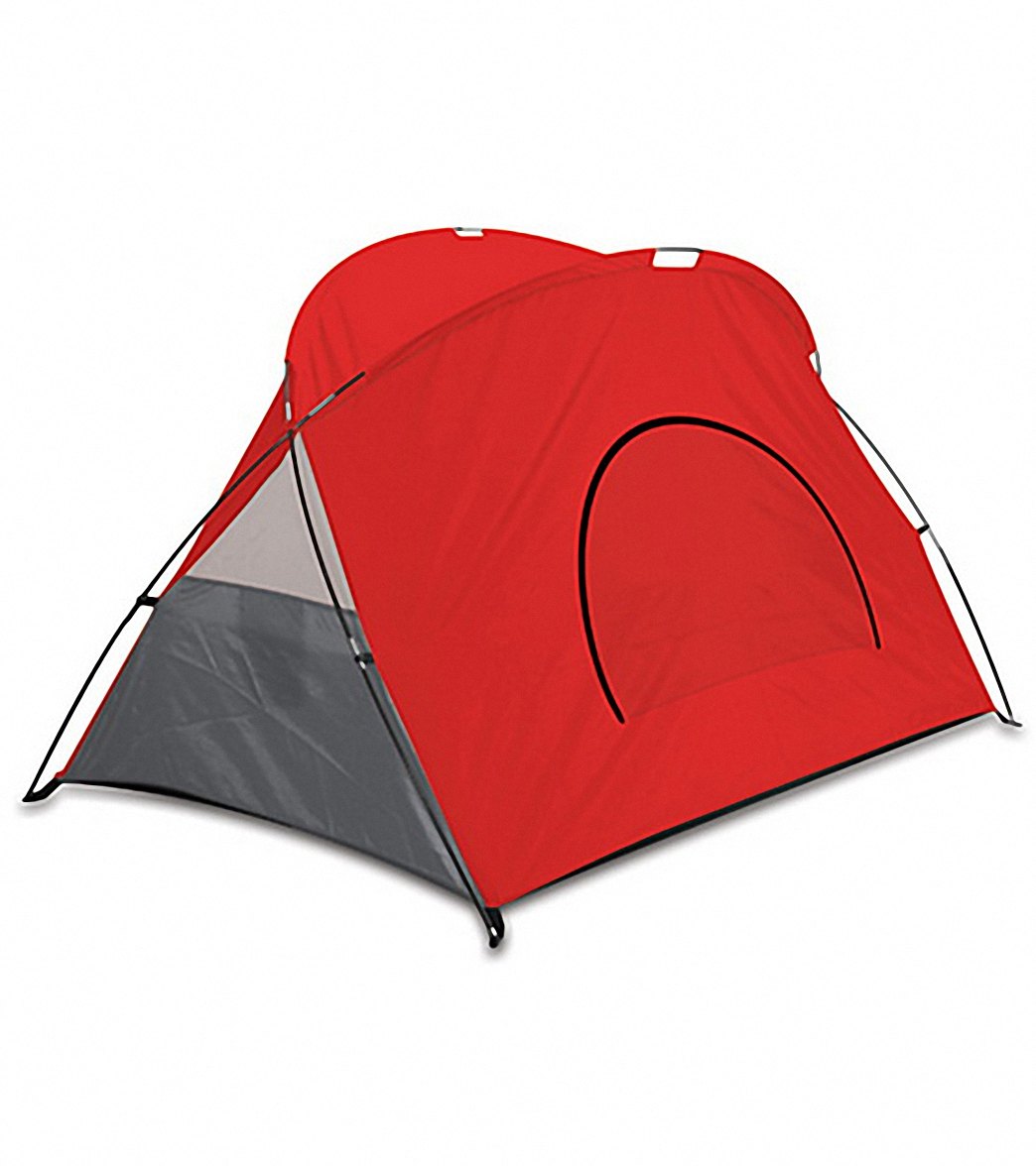 A red and grey tent with a white logo on the front is displayed against a white background. The tent has a large circular opening at the top and a smaller entrance at the bottom. The tent fabric is smooth and taut, and the tent appears to be in a clean and unused condition.