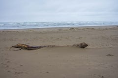 A large, weathered piece of driftwood lies on a sandy beach with gentle waves in the background.