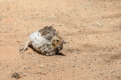 A small, fluffy chick with brown and white feathers is sitting on a sandy ground. The chick has a round body, short legs, and a small beak. It appears to be looking to the side, and its feathers are ruffled, giving it a soft and endearing appearance. The background is a plain, sandy surface with no other objects or animals visible.