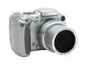 A silver digital camera with a black lens cap is displayed against a white background.