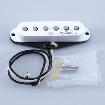 A white guitar pickguard with a black pickguard and a black pick is displayed on a white background. The pickguard has a black strap attached to it, and there are two screws and two yellow plastic spacers visible. The pickguard is signed by the artist, and there is a black plastic bag containing the screws and spacers.