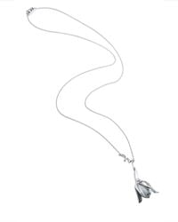 Egy ezüst nyaklánc finom toll medállal látható fehér háttér előtt.
