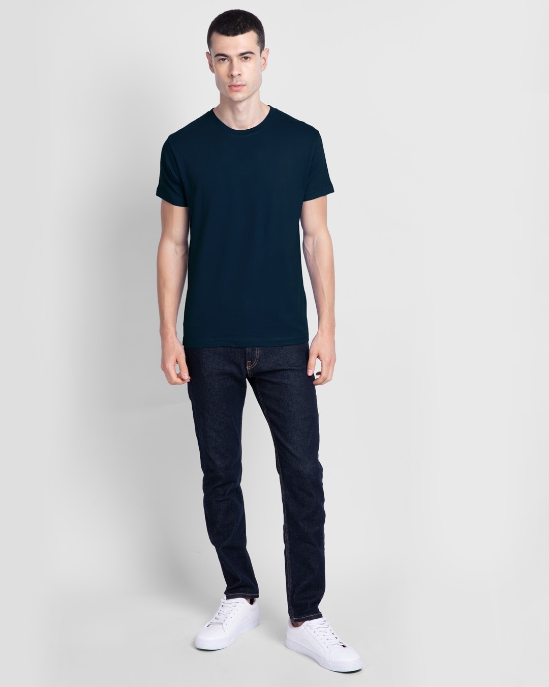 A man is standing against a white background wearing a dark blue t-shirt and dark blue jeans. He has white sneakers on his feet.