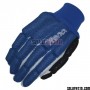 A close-up image of a blue glove with a white logo on the back of the hand. The glove has a textured palm and fingers, and the cuff is rolled up, revealing a blue interior. The glove is against a white background.