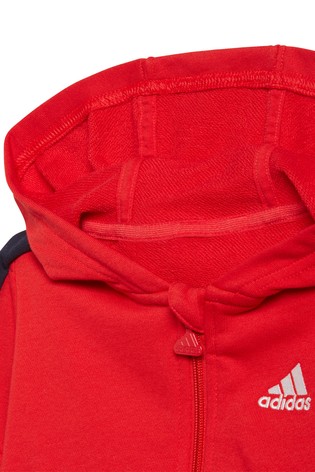 Fehér háttér előtt egy piros kapucnis kapucnis cipzárral és egy kis Adidas logóval az elején látható.
