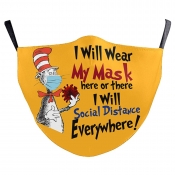 A yellow mask with a cartoon character resembling the Cat in the Hat from Dr. Seuss, wearing a surgical mask, holding a red flower, and a caption that reads 'I WILL WEAR MY MASK HERE OR THERE I WILL WEAR MY MASK I WILL WEAR MY MASK SOCIAL DISTANCE EVERYWHERE!