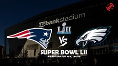 Digitális kijelző, amelyen a New England Patriots és a Philadelphia Eagles logója látható, alatta a „SUPER BOWL LI” szöveggel és a „2017. FEBRUÁR 4.” dátummal. A háttérben lévő stadion a texasi Houstonban található NRG Stadion, melynek homlokzatán az „NRG STADIUM” és „US BANK” felirat látható.