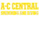 A plain white t-shirt with the text 'A-C CENTRAL SWIMMING AND DIVING' in yellow font at the top.