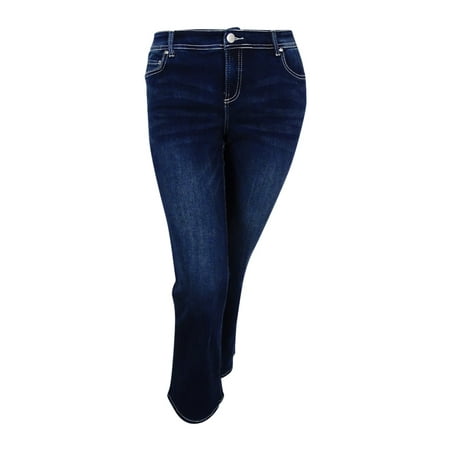 A pair of blue jeans with a straight leg and a button fly is displayed against a white background. The jeans have a belt loop at the top and a zipper fly.