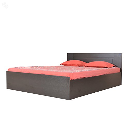 A modern bed with a dark wooden frame and a red and white patterned mattress cover. The bed is set against a white background.