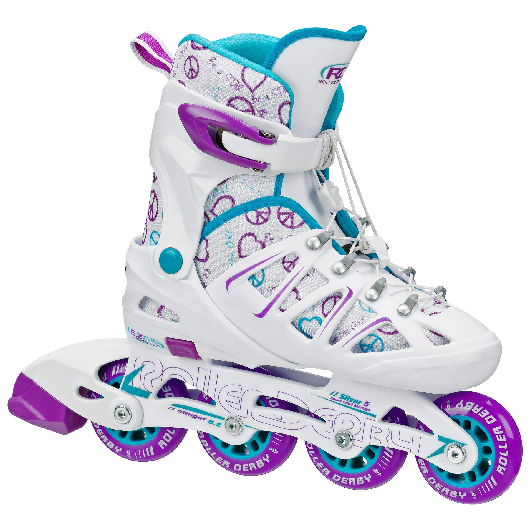 Egy pár fehér görkorcsolya lila kerekekkel és kék-fehér kerékvédővel. A korcsolyák lábujjvédőjén békejel, a saroksapkákon pedig szívdísz látható. A fűzők lila színűek, a kerekekre pedig a „Roller Derby” márkanév van ráírva.