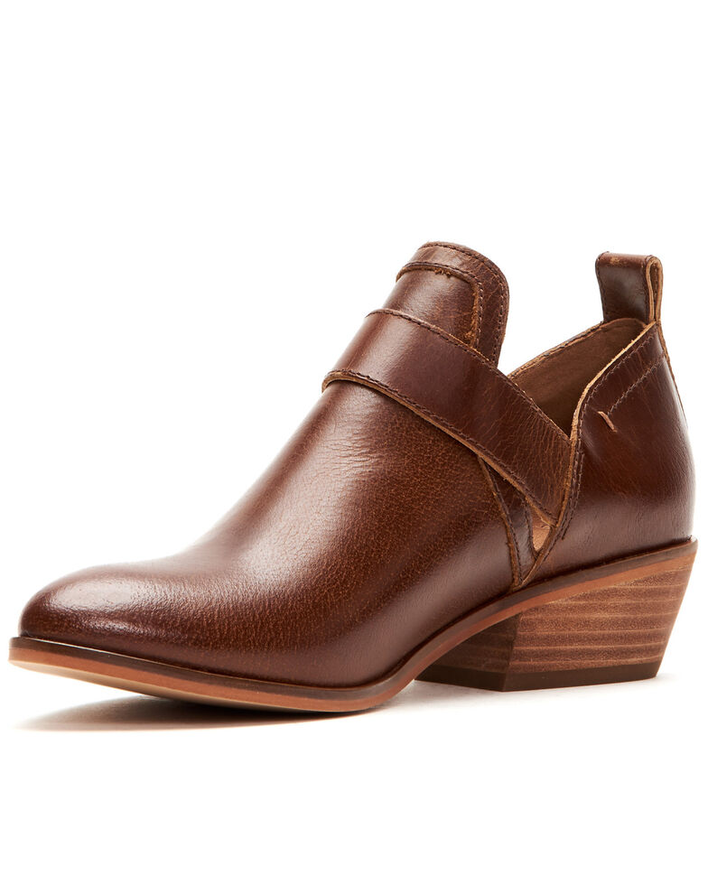 A pair of brown leather shoes with a sleek design and a low heel. The shoes have a smooth, polished finish and are presented against a white background.