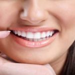 Az első kép egy személy arcát mutatja közelről, széles, őszinte mosollyal. A személy sima arcbőrű, a hangsúly a felső ajakon és a fogakon van, amelyek tiszták és jól karbantartottak. A háttér elmosódott, kiemelve az alany arcát.