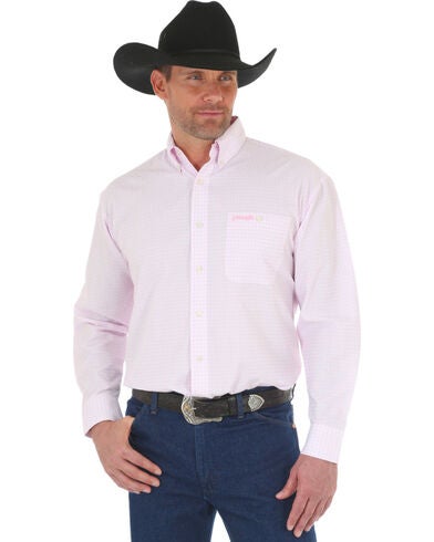 A man wearing a cowboy hat, a pink shirt with a pocket, and blue jeans with a belt buckle.