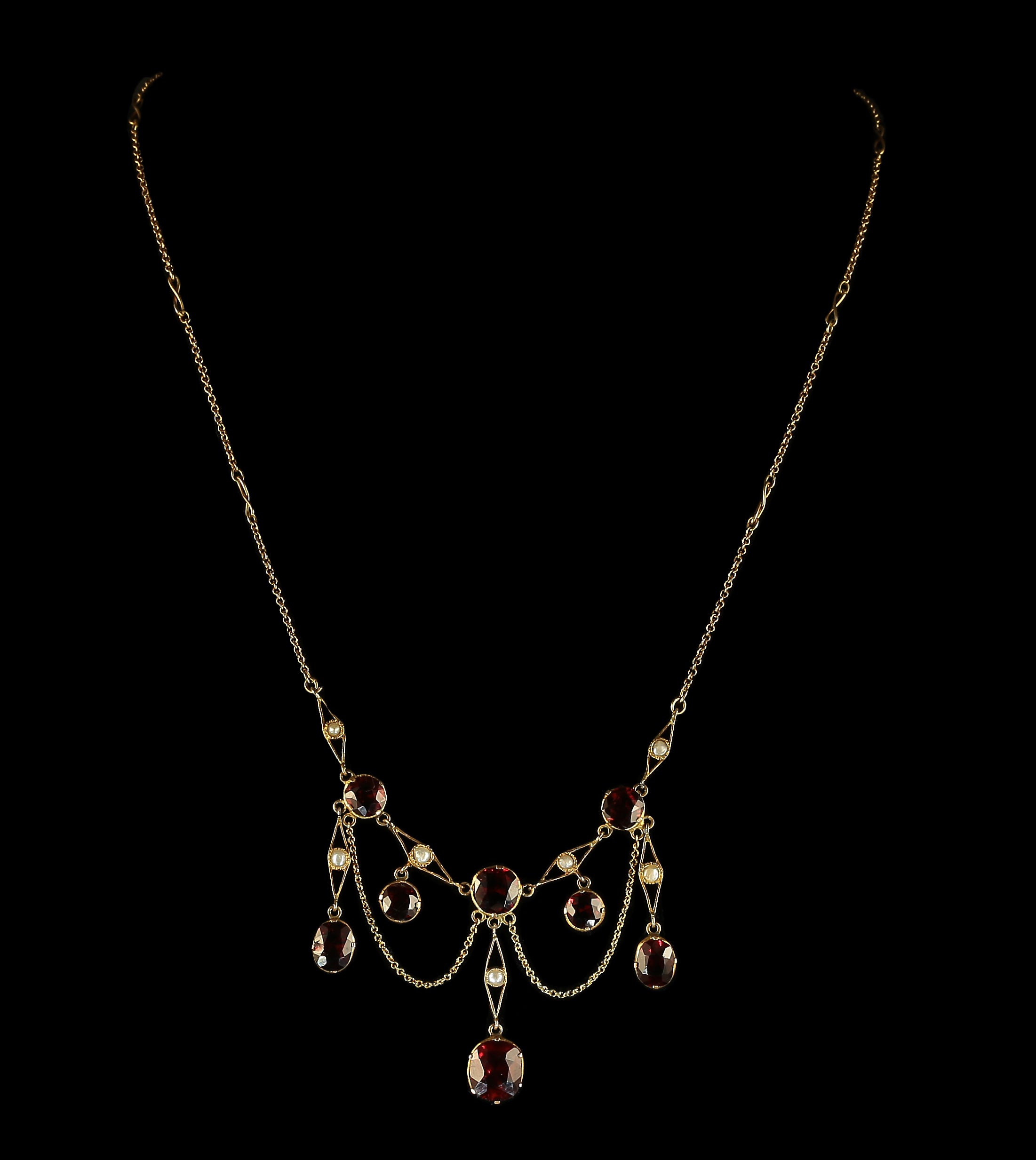 Közeli kép egy nyakláncról, részletes kialakítással, több gyöngyszálat és vörös drágaköveket tartalmaz. A nyaklánc sötét háttér előtt áll, kiemelve a bonyolult részleteket és a drágakövek csillogását.