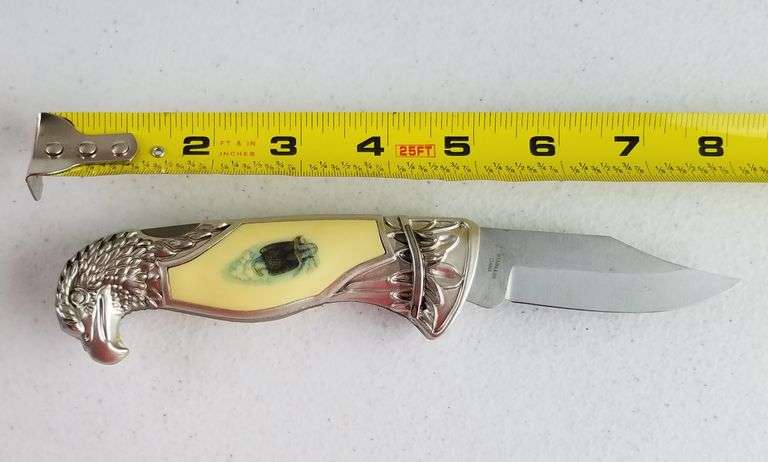 A silver pocket knife with a yellow handle featuring a green gemstone and a bird design lies next to a yellow ruler with black markings on a white surface.