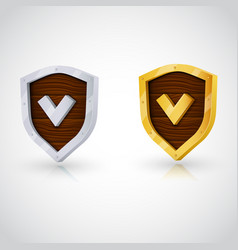 Two shields with a checkmark design are displayed side by side. The left shield has a wooden texture with a brown color, and the right shield has a golden texture with a yellow color. Both shields have a white checkmark in the center.