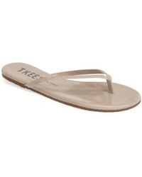 A pair of beige flat sandals with a thin strap and a curved metal buckle on the right foot. The sandals have a smooth, glossy finish and are placed on a white background.