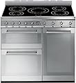 A sleek, modern stainless steel oven with a smooth, reflective surface and a black glass top. The oven has a contemporary design with a minimalist aesthetic, featuring a single door with a handle and a digital control panel. The oven has four burners on top, each with a black knob and a stainless steel finish. The oven also has a built-in timer and a digital display.