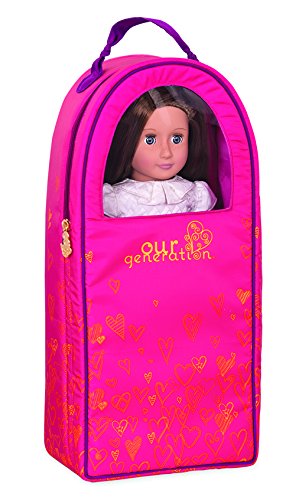 A pink backpack with a heart pattern and a clear plastic window on the front, showcasing a doll inside. The backpack has a zipper closure and a small gold zipper pull. The word 'OUR' is written in yellow on the front, and the word 'GENERATION' is written in yellow on the side.