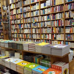 A large bookshelf filled with various books of different sizes and colors. The books are arranged in a way that they are visible from the front, with some books standing upright and others lying flat. The bookshelf is located in a room with a wooden floor, and there is a wooden table in the foreground with more books placed on it. The lighting in the room is bright, highlighting the details of the books and the wooden surfaces.