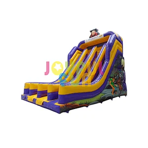 Színes felfújható csúszda lila és sárga dizájnnal, tetején egy rajzfilmfigurával. A csúszdához több lépcső vezet, és fehér háttér előtt áll, bal oldalán kis sárga logóval.