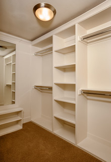 A spacious white closet with multiple shelves and a hanging rod. The closet is well-lit by a ceiling light and has a beige carpet on the floor. There is a mirror on the left side of the closet, and the shelves are empty.