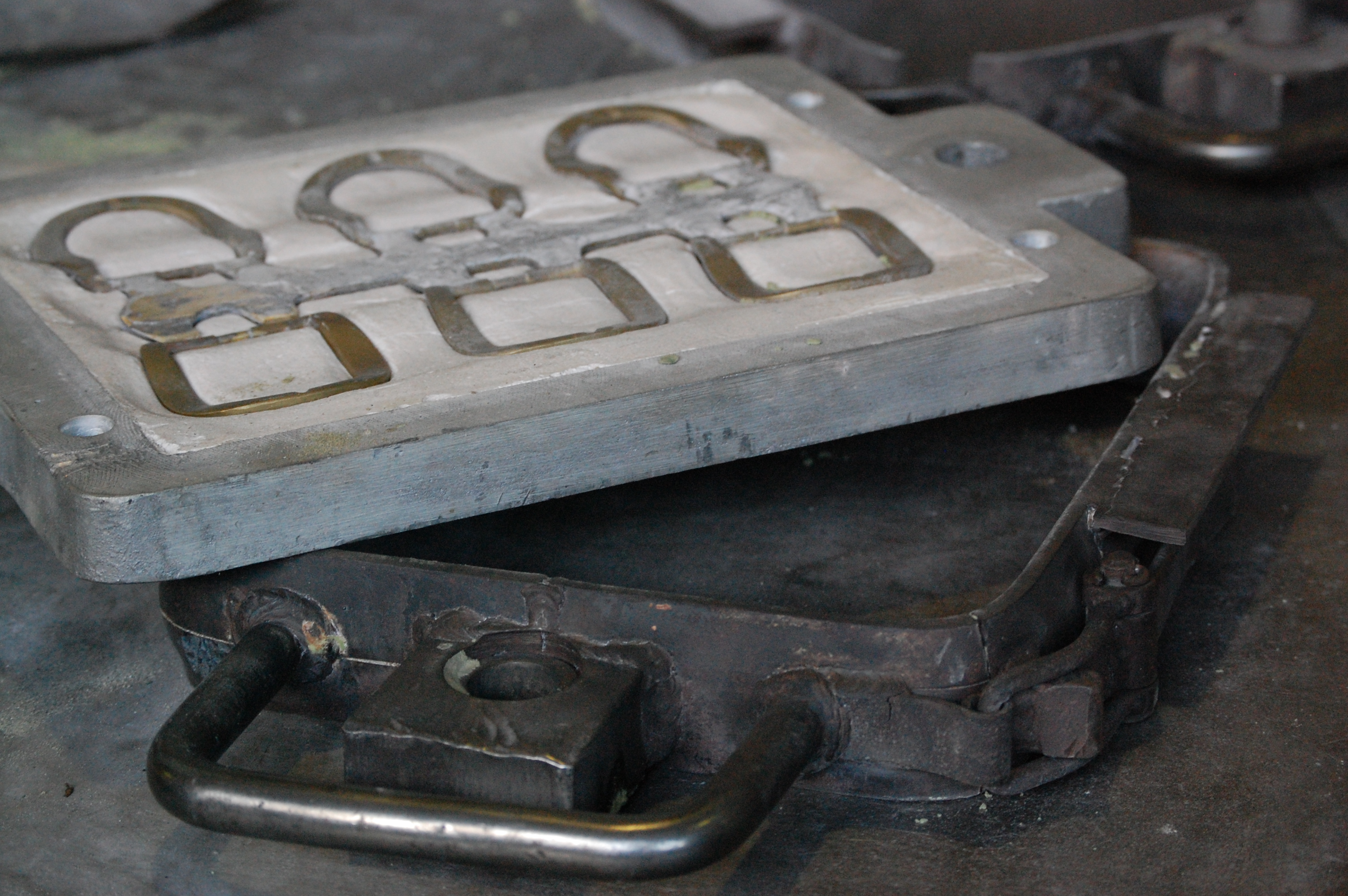 Közeli kép egy fémtárgyról, kör alakú lyukakkal és egy fémlánccal. Úgy tűnik, hogy a tárgy egy nagyobb szerkezet része, esetleg egy zár vagy egy mechanizmus. A felület, amelyen nyugszik, sötét, a világítás pedig olyan, hogy a fém fényvisszaverő tulajdonságokkal rendelkezik.