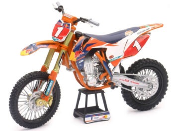 A dirt bike részletes modellje piros és narancssárga színvilággal, az első sárvédőn 1-es számmal, a hátsó sárvédőn pedig 7-es számmal. A kerékpár fekete állványon van kihelyezve, előtte egy kis emléktábla. A modell olyan bonyolult részletekkel rendelkezik, mint a lánc, a felfüggesztés és az ülés, és fehér háttér előtt áll.