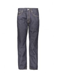A pair of blue jeans with a button fly and belt loops is displayed against a white background. The jeans have a straight leg and are cuffed at the bottom. There are visible creases and folds on the fabric, indicating the jeans are worn.
