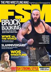 Egy birkózómagazin borítója, amelyen egy izmos, szakállas és tetoválásos férfi látható, fekete felsőt és birkózóruhát visel, tátott szájjal, mintha kiabálna. Az „FSM” cím jól láthatóan, nagy betűkkel jelenik meg a tetején. A magazin a „The Pro Wrestling Mag” címet viseli, és „Lighting the Spirit” felirattal rendelkezik. A borítón számos más bunyós és birkózáshoz kapcsolódó kép és szöveg található, köztük egy hosszú hajú nő, a jobb alsó sarokban brit zászló látható.