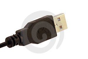A close-up image of a black USB cable with a gold connector on the end. The cable is coiled and has a circular pattern on the black part. There is a circular logo in the bottom right corner of the image.