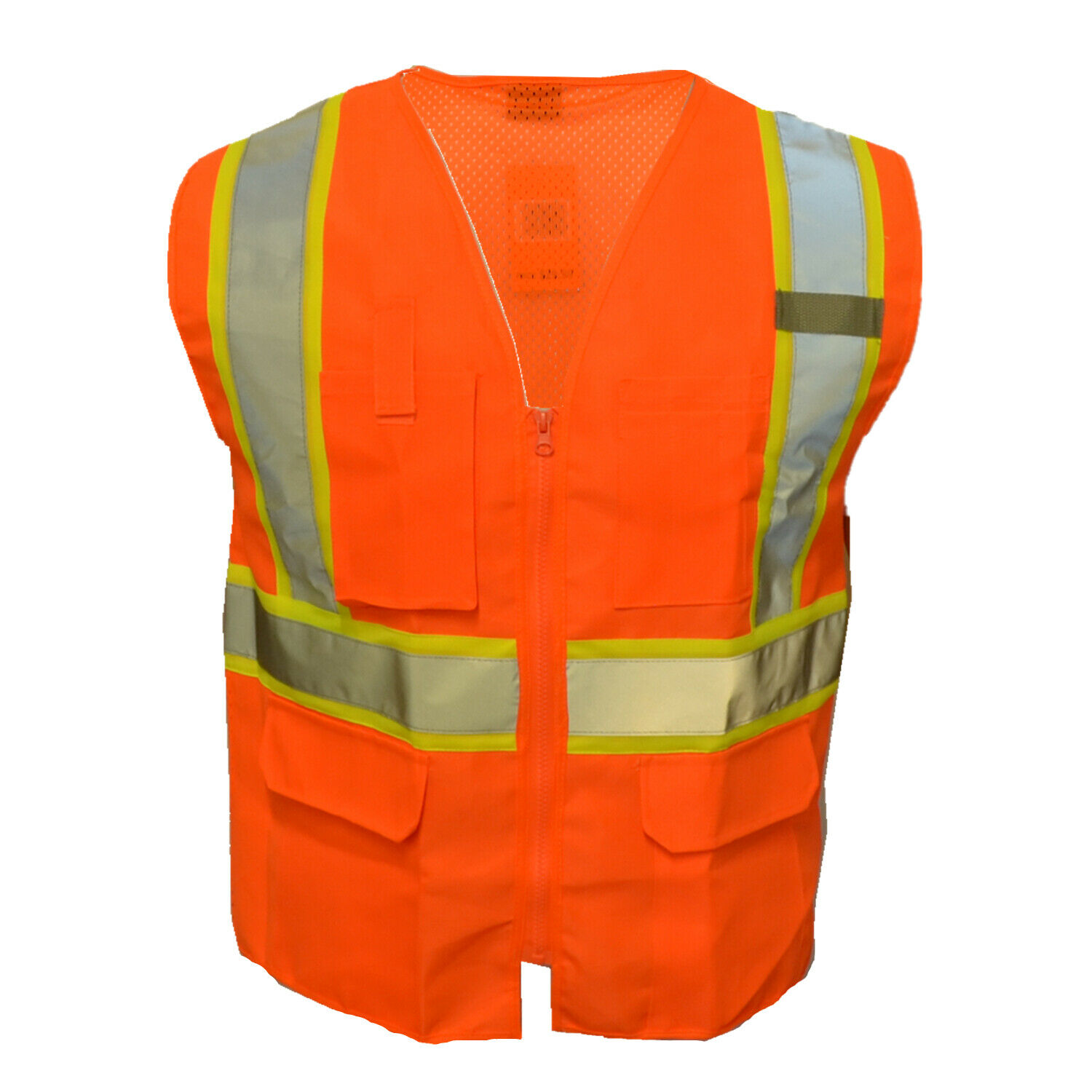 A bright orange safety vest with reflective stripes and a zippered front pocket is displayed against a white background. The vest has a mesh back panel and a reflective logo on the upper left side.