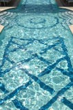 The first image shows a close-up of a swimming pool with clear blue water. The pool has a decorative pattern on the bottom, featuring blue and white tiles arranged in a geometric design. The water is calm, reflecting the pattern on the pool floor. The image is taken from a low angle, looking up at the pool, and the focus is on the water's surface and the pattern below.