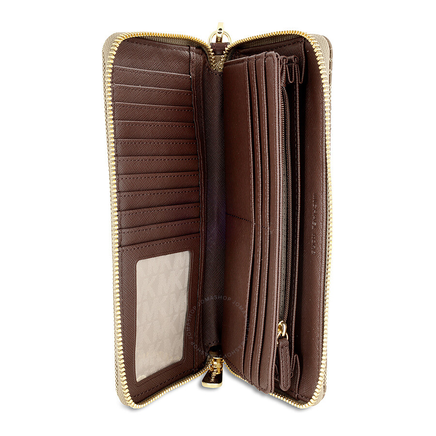A brown leather wallet with a gold zipper closure is open, displaying its contents. The wallet has multiple card slots and a cash compartment. There are several cards visible in the slots, and the cash compartment is empty. The wallet is placed against a white background.