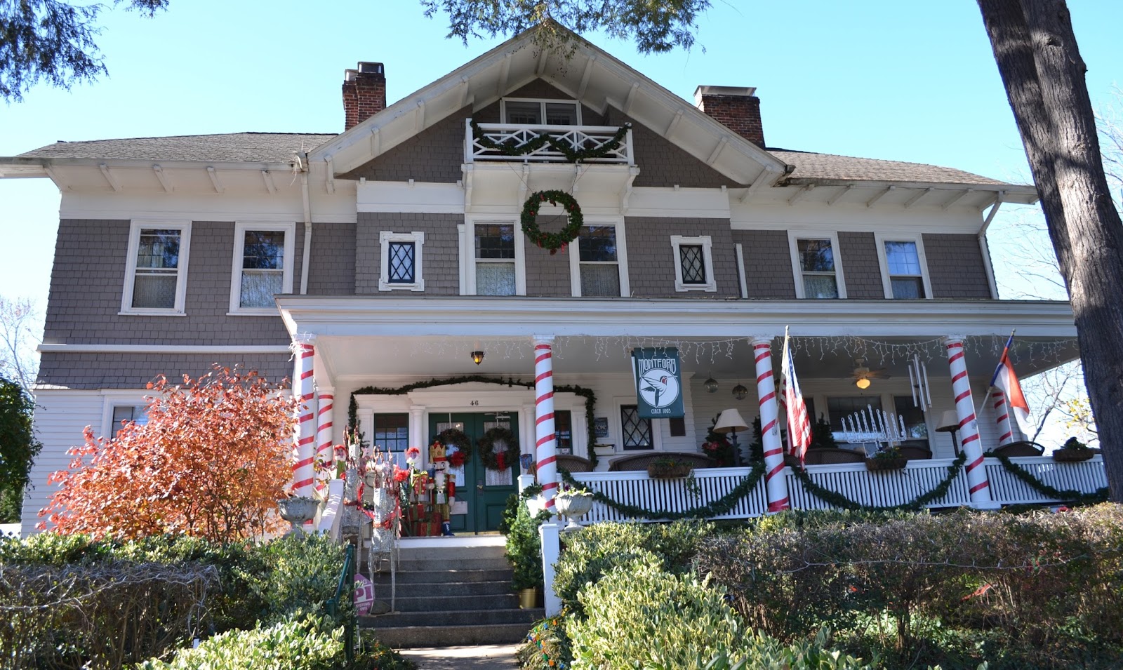 A Victorian-style house is decorated with Christmas wreaths and garlands. The house has a prominent front porch with a white railing and a green door. The roof is adorned with a festive wreath, and the windows are dressed with garlands and bows. The house is surrounded by a well-manicured lawn and a hedge, with a clear blue sky above.