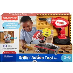 Egy gyerek egy játékfúrókészlettel játszik, amely egy játékfúrót, egy játékfúrót és egy játékfúró-tartót tartalmaz. A gyermek kék inget visel, és mosolyogva tartja a játékfúrót. A játékfúrókészlet egy dobozba van csomagolva, amelyen a „Fisher-Price Drill-in Action Tool Set” és „2-6 years” felirat olvasható. A dobozon egy figyelmeztető címke is található, amelyen ez áll: „Wrrrrr”, valamint egy „Try Me” gomb.