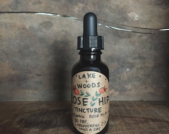 A small bottle of liquid with a black cap is placed on a wooden surface. The label on the bottle features hand-drawn illustrations of a lake, woods, and a rose, along with text that reads 'LAKES & WOODS ROSE HIP TINCTURE'. The label also includes instructions and a warning about the product's potency.