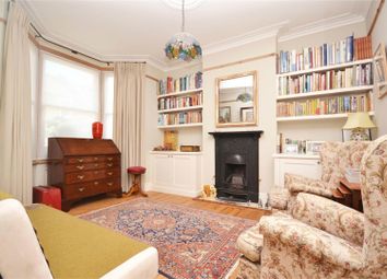 A cozy living room with a patterned rug on the wooden floor, a white armchair with floral upholstery, a wooden chest of drawers with a red vase on top, and a bookshelf filled with books. There is a fireplace with a mirror above it, and a ceiling light hanging down.