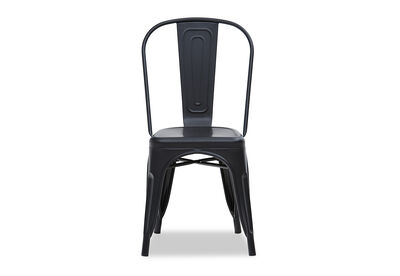A sleek, modern black plastic chair with a curved backrest and a flat seat, featuring a minimalist design with a simple, straight leg structure.