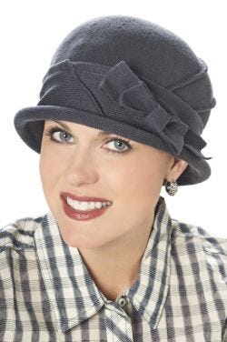 Egy rövid bob hajú nő kék-fehér kockás inget és szürke kalapot visel fekete szalaggal.