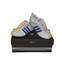 Egy kék csíkos fehér Adidas tornacipő egy ezüst cipzárral ellátott fekete dobozra került. A doboz fehér alapon van.