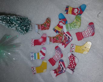 A collection of colorful Christmas socks is scattered on a white surface. The socks are decorated with various patterns and designs, including stripes, polka dots, and festive holiday motifs. Some socks have a red and white color scheme, while others feature green, yellow, and blue hues. The socks are arranged in a way that suggests they are being sorted or displayed.