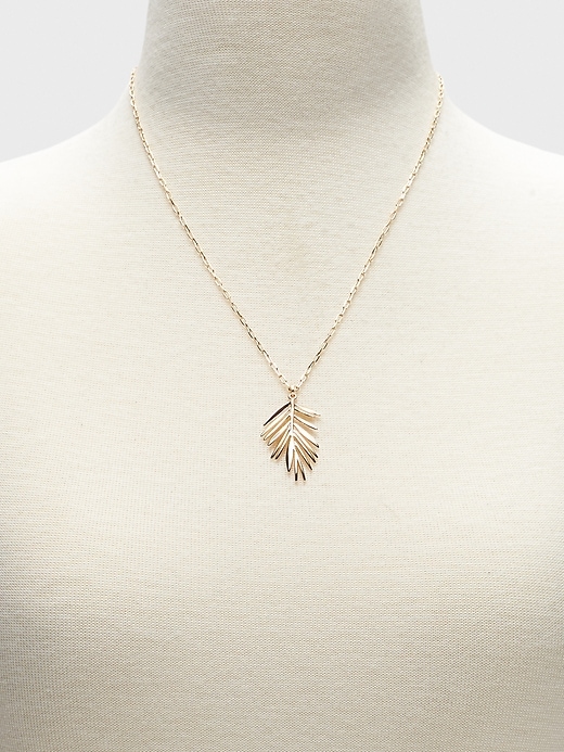 A delicate gold necklace with a small feather pendant is displayed on a white mannequin.