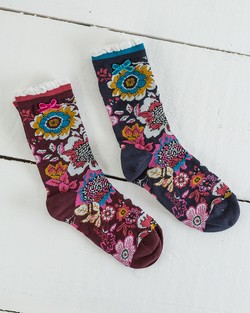 A pair of colorful socks with a floral pattern is laid out on a white surface. The socks have a maroon heel and toe, with a blue cuff at the top. The floral design features a variety of flowers and leaves in shades of pink, blue, yellow, and green. The socks are placed side by side, with the left sock in the foreground and the right sock in the background.