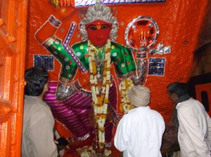 A group of people is gathered around a large, ornate statue of a deity with a red face and green and gold attire. The statue is adorned with intricate patterns and is surrounded by a halo of light. The people are observing the statue with reverence, and some are wearing traditional headgear.