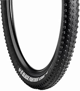 A close-up of a black bicycle tire with a white rim. The tire has a tread pattern and is labeled 'Black Panther'. The background is a plain white color.