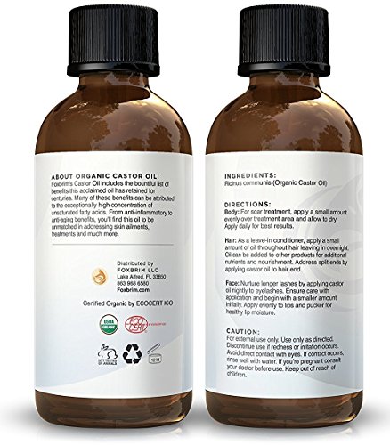 Two identical bottles of organic castor oil with black caps are placed side by side against a white background. Each bottle has a label with the text 'About Organic Castor Oil' and a list of benefits and instructions. The label also features a logo and a warning symbol. The bottles are positioned at an angle, with the label facing the viewer.