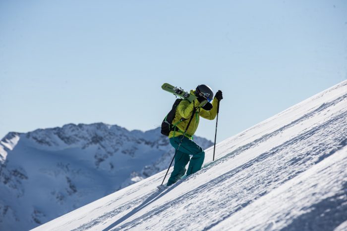 Sárga kabátban és kék nadrágban egy személy síel le a havas hegyoldalon. Síbotot tartanak és hátizsák van a hátukon. Az ég tiszta és kék, a nap ragyogóan süt.