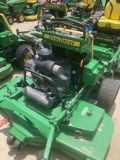 A green lawn mower with a black seat and a yellow and black steering wheel is parked on a concrete floor. The mower has a large black engine cover and a black and silver exhaust pipe. There are other lawn mowers in the background, and the floor appears to be a storage area for lawn care equipment.